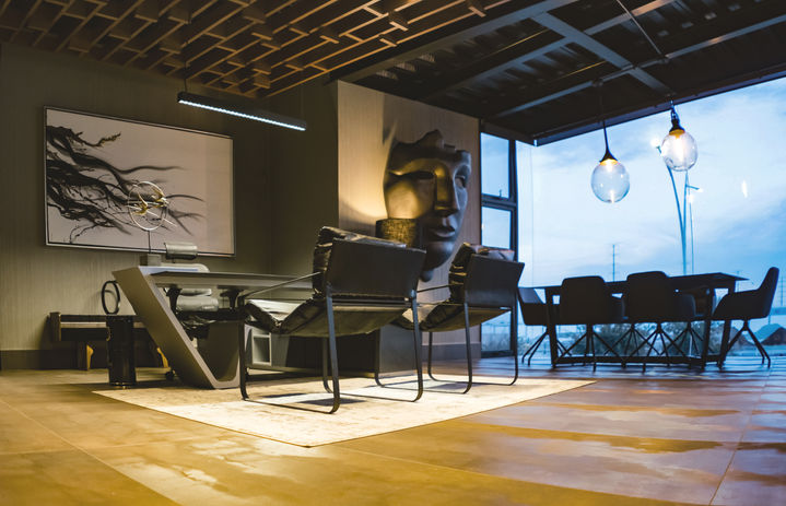 La fuerza que transmiten los materiales industriales, es aprovechada para lograr un ambiente de trabajo lleno de calidez y frescura.